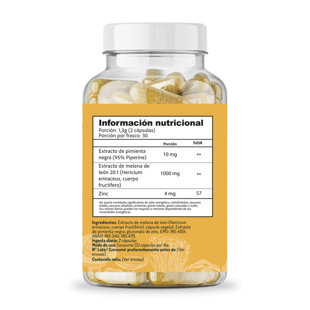 Melena de León | Claridad Mental | Cápsulas es un suplemento natural formulado para apoyar la claridad mental, el enfoque y la agilidad cognitiva. Está elaborado a base de extracto de Melena de León (Hericium erinaceus), un hongo funcional reconocido por su aporte a la salud cerebral.